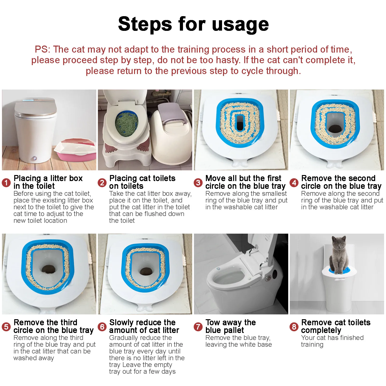 5、Multipurpose: The cat potty toilet training kit is compatible with toilets of all sizes and shapes, including round and elongated. Perfect for cats who live in apartments.